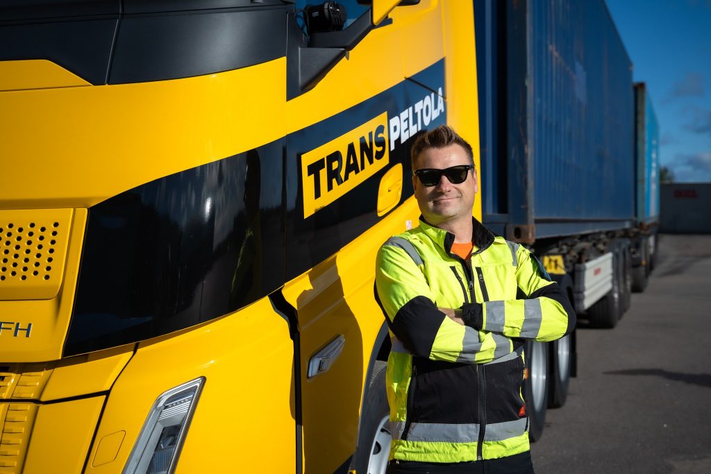 Kuljettaja seisoo keiltaisen rekan edessä