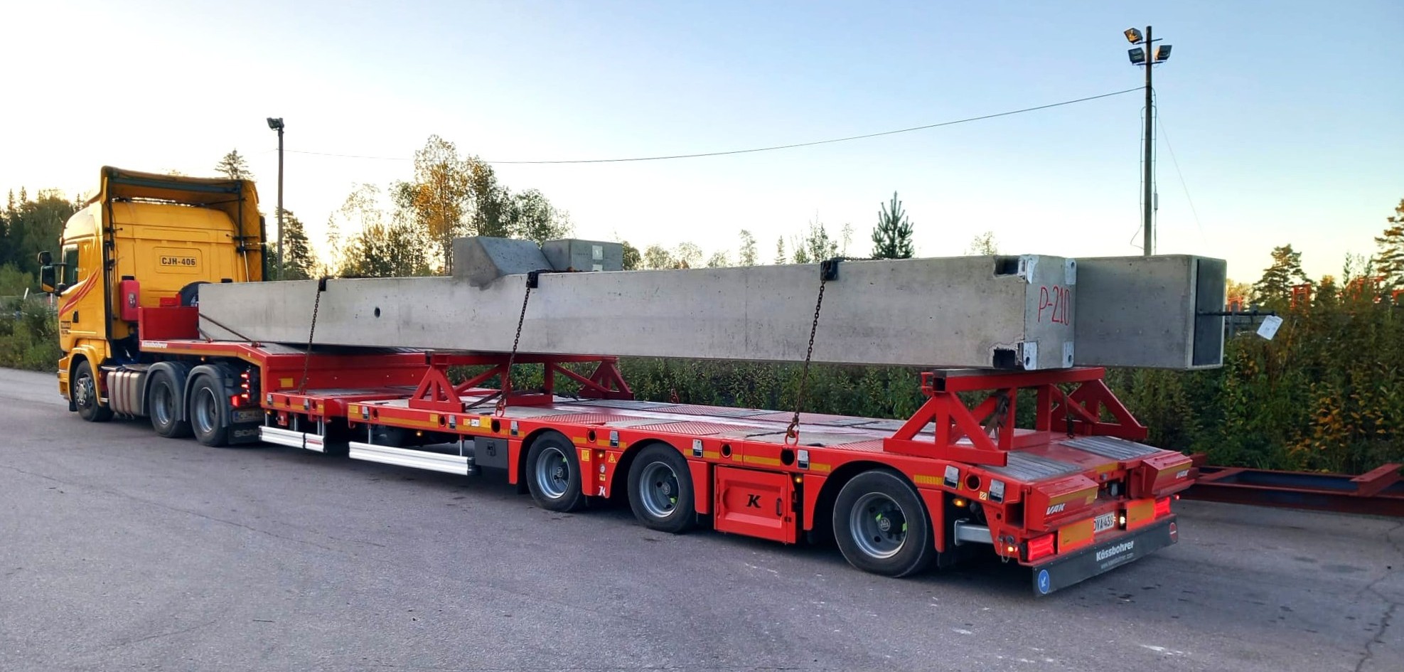 Edellinen kuva Lavetti_Transpeltola Kuvassa on rekka jonka perässä on lavetti. Kuormana on betonipalkkeja.